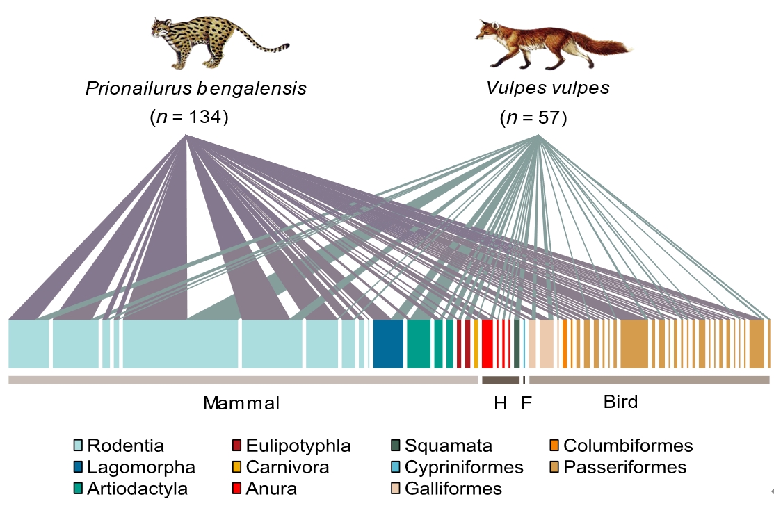 2025年3月,北京师范大学东北虎豹国家野外台站王天明教授在动物生态学经典期刊Journal of Zoology发表研究论文“Dietary niche partitioning of two sympatric mesocarnivores in a cool temperate forest ecosystem: The influence of seasonal variation and apex carnivores”。该研究通过粪便DNA宏条形码技术,系统解析了东北温带森林中赤狐(Vulpes vulpes)与豹猫(Prionailurus bengalensis)的食性构成和分化,揭示了季节性资源波动和顶级捕食者虎豹的存在对其生存的重要作用,为深入理解中型食肉动物的共存机制提供了重要基础。