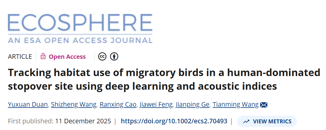 - 王天明教授发文利用声学指数+深度学习方法追踪迁徙鸟类的活动和生境利用2025-12-16 王天明教授在《Ecosphere》上发表研究论文“Tracking habitat use of migratory birds in a human-dominated stopover site using deep learning and acoustics indices”,该研究应用PAM技术监测了中国敬信湿地的迁徙鸟类,结合声学指数和深度学习方法揭示了迁徙雁鸭类在以人类活动为主导的中途停歇地——敬信湿地的栖息地使用。