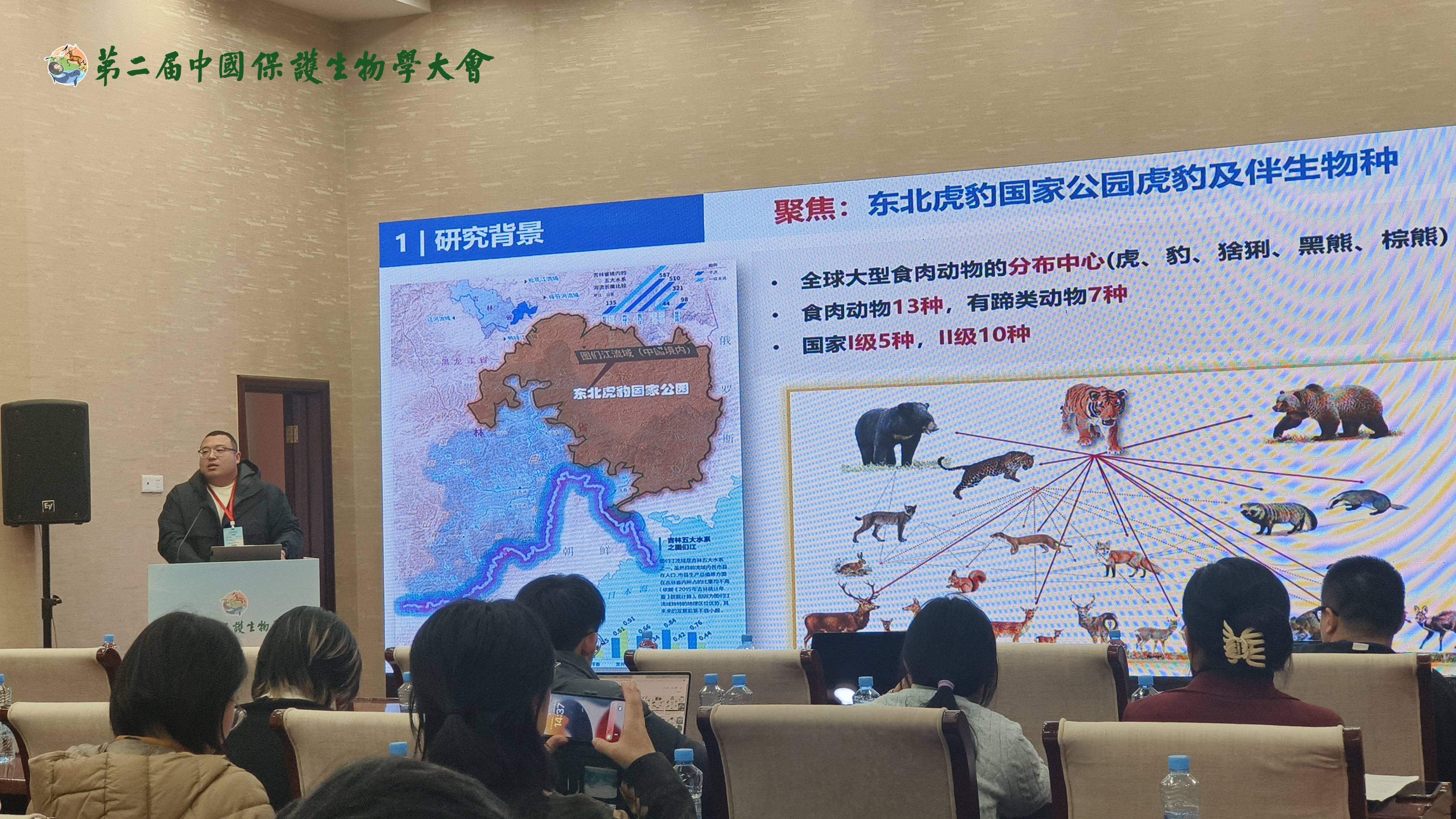 站长王天明教授作了题为“东北虎豹国家公园保护成效10年评估”(王润玺讲师代讲)的报告,王润玺讲师作了题为“蚂蚁生物地理区划揭示大尺度生物多样性保护框架中纳入昆虫类群的必要性”的报告,冯佳伟博士作了题为“人类形成的恐惧景观对同域大型猫科动物时空互作的影响”的报告,博士研究生王丽博作了题为“与旗舰食肉动物为邻”的报告。